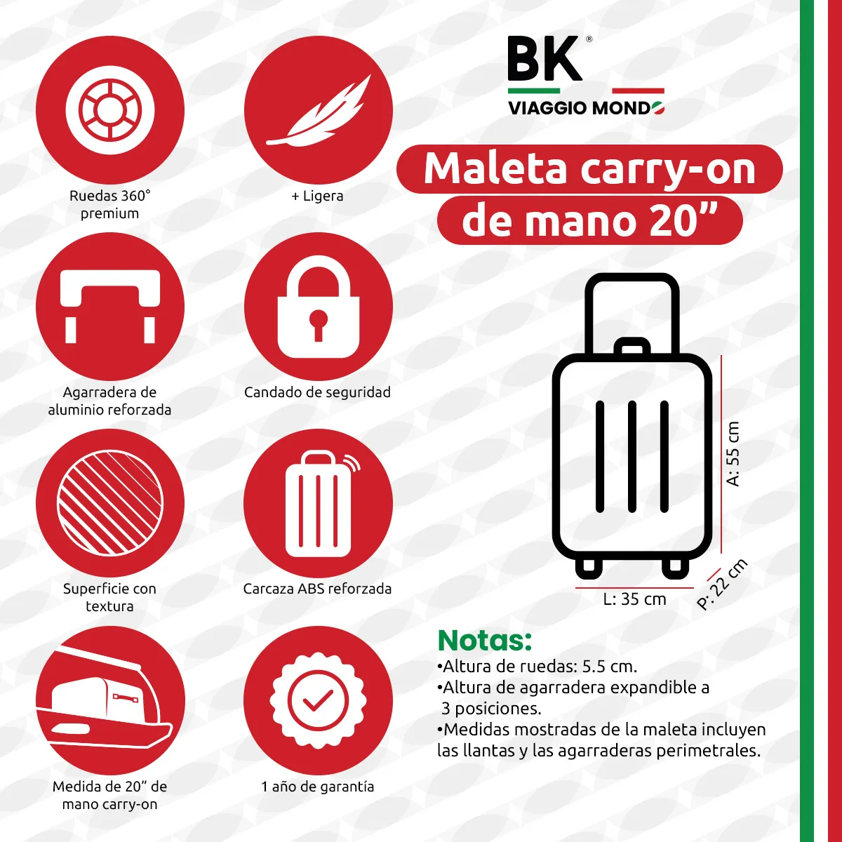 Armored Travel® Una maleta 20” carry-on de mano – Armored Travel vendida en esta publicación. ¡Precio incluye iva, facturamos! **Maleta de 20″ se considera de mano o carry-on, aceptada por todas las aerolíneas en cabina. Modelos disponibles: Stone, Gris Oxford, Azul Navy, Rosa, Lila, Palace, Berlin, Andrea y Chess. Medidas de las maletas incluidas las llantas, y los sujetadores perimetrales: Medidas = 35*22*55 cm. Peso = 2.3 kg. Especificaciones: *Diseño reforzado único texturizado exclusivo Armored Travel ®. *Candado de alta seguridad TSA-LOCK. Cerradura TSA montada en el lateral que permite que solo los agentes de la TSA inspeccionen tus bolsas sin dañar la cerradura cuando viajas. La cerradura no es fácil de perforar o violar; por lo tanto, tus cosas en el equipaje se encuentran más protegidas, con mejor privacidad. Instrucciones de configuración dentro de la maleta. *Pruebas realizadas a nuestras maletas Armored Travel ®. ->Extensión de agarradera y sujetadores se prueba en 5000 ocasiones. ->Prueba de impacto directo con artefactos de 40 kilogramos de peso. ->Prueba de rodado y golpes hasta por 360 minutos continuos. ->Llantas se someten a desgaste por 500 minutos continuos. ->Prueba de caídas hasta en 500 ocasiones. *La maleta tiene capacidad de almacenar de 10 hasta 25kg. *Maleta de mano carry-on 20”, tu mejor opción para viajes cortos o de negocios, por su medida y compartimientos prácticos. *Carcaza texturizada ABS doble refuerzo calibre: 20” 2.7 mm de espesor. Lo que hace de la maleta más durable y resistente. *Agarradera de ALUMINIO, ligera, ergonómica ajustable y resistente que te permite maniobrar en espacios reducidos y proporcionar un movimiento sin esfuerzo. Se expande en 3 posiciones: 1) 60cm de alto, 2) 80cm de alto y 3) 100cm de alto. La referencia de altura considera las llantas, la maleta y la agarradera expandible en sus 3 posiciones. *Ruedas dobles 360° nueva tecnología (multidimensionales silenciosas y suaves). *Diseño de compartimientos prácticos, útiles, para hacer del acomodo de tu ropa, accesorios, artículos en general, algo simple y seguro. *Materiales forros compartimientos interiores: 230D 100%poliéster. *Material de agarraderas Polipropileno (PP). *Cierres perimetrales trabajo duro. *Garantía directa 12 meses.